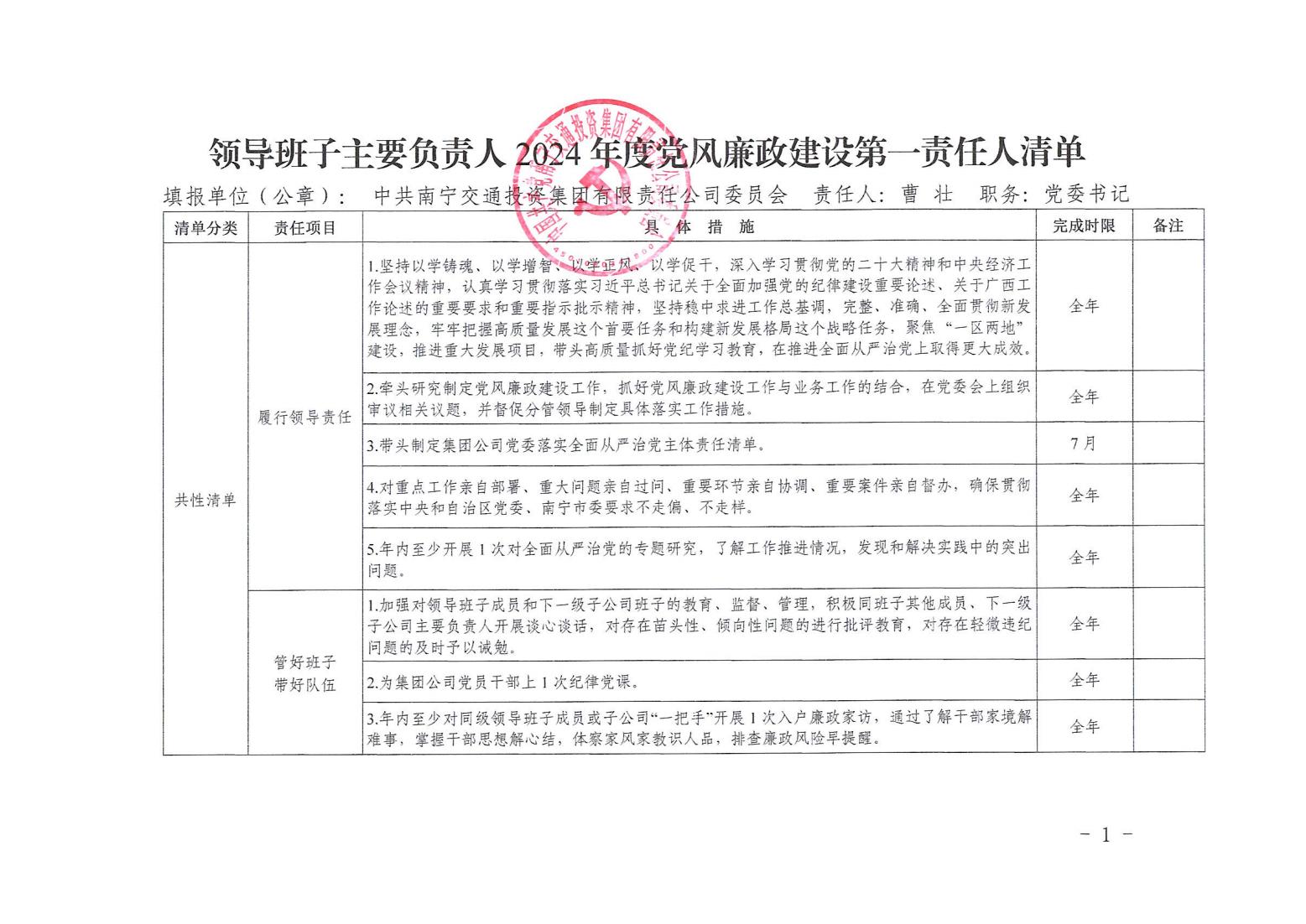 領(lǐng)導班子主要責任人2024年度黨風廉政建設(shè)第一責任人清單