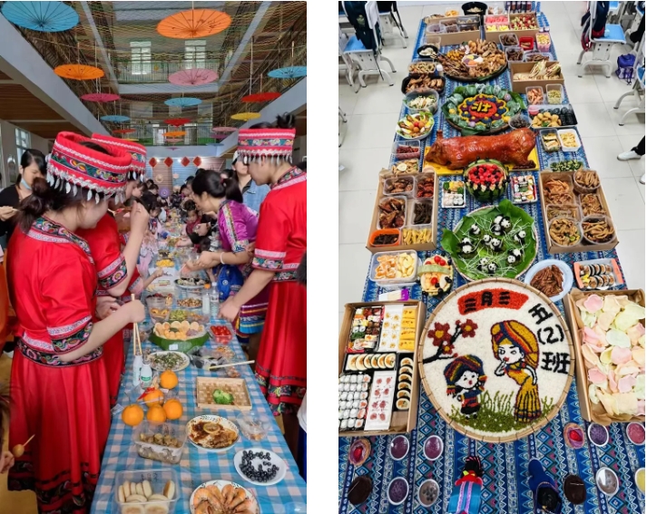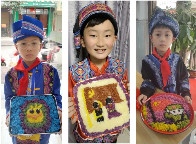 “長桌宴”又稱合攏宴,是侗族、苗族、瑤族等多個民族的風俗習慣,常用于接親嫁女、滿月酒、村寨聯(lián)誼等宴飲活動,代表最為隆重的待客禮俗,已有幾千年歷史。“長桌宴”上有壯族特色的五色糯米飯、艾葉糍粑、壯粽,苗族的傳統(tǒng)佳肴,還有黎族的三色飯……一份份美食造型美觀、色彩鮮艷、香味撲鼻。圖為集團職工拍攝的孩子參加學?!叭氯被顒?。