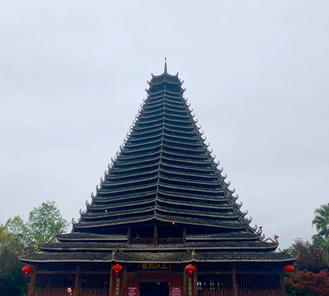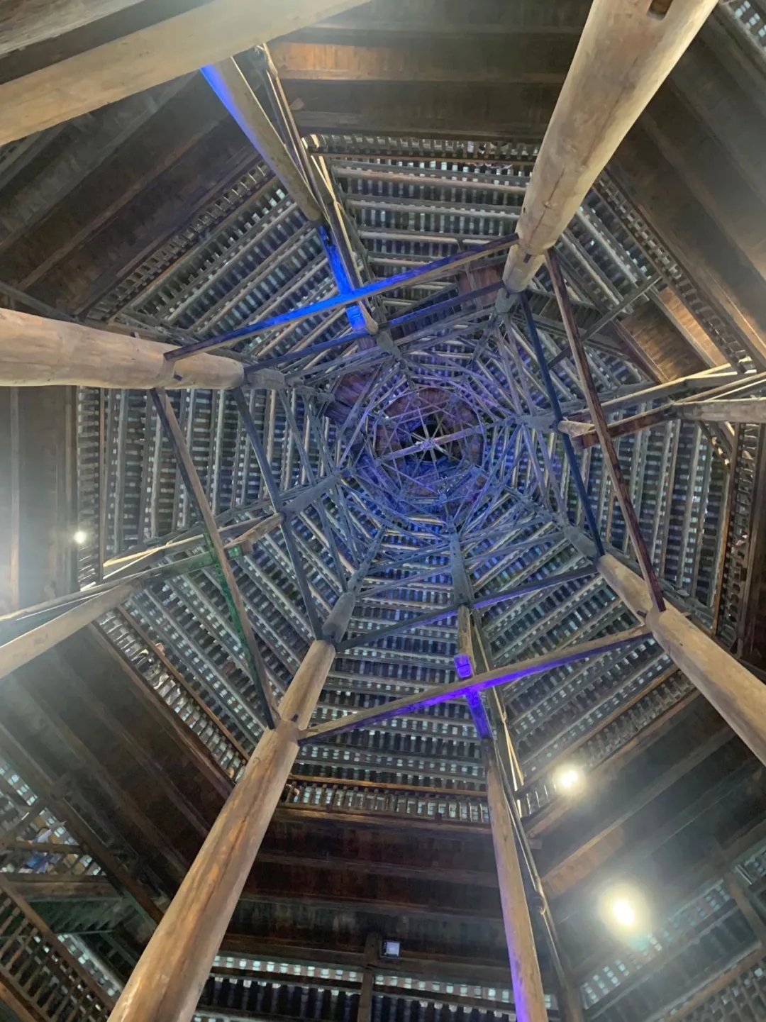 仰觀閃閃魔幻,感受侗族建設的精美藝術,把疏密、粗細、剛柔等完美地結成一個整體,展現(xiàn)侗族工匠的精美建筑技藝。不用一顆鐵釘,結構十分嚴謹穩(wěn)固。樓內(nèi)四根杉木大柱直徑都超過70厘米,樹齡均在百年以上,這在鼓樓建筑史上是唯一的。